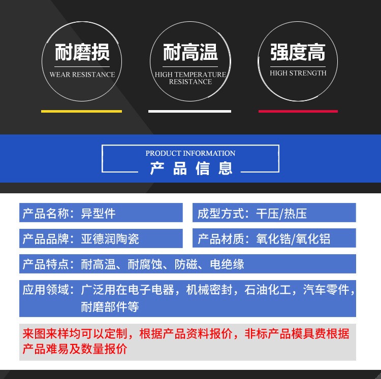 陶瓷異型件的性能特點1. 硬度大其洛氏硬度為HRA80-90,硬度僅次于金剛石,遠(yuǎn)遠(yuǎn)超過耐磨鋼和不銹鋼的耐磨性能。2. 耐磨性能極好經(jīng)中南工大粉末冶金研究所測定,其耐磨性相當(dāng)于錳鋼的266倍,高鉻鑄鐵的171.5倍。在同等...