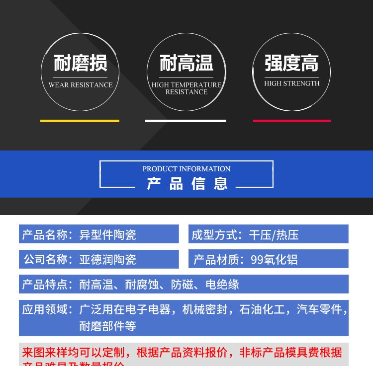 陶瓷異型件的性能特點1. 硬度大其洛氏硬度為HRA80-90,硬度僅次于金剛石,遠遠超過耐磨鋼和不銹鋼的耐磨性能。2. 耐磨性能極好經中南工大粉末冶金研究所測定,其耐磨性相當于錳鋼的266倍,高鉻鑄鐵的171.5倍。在同等...